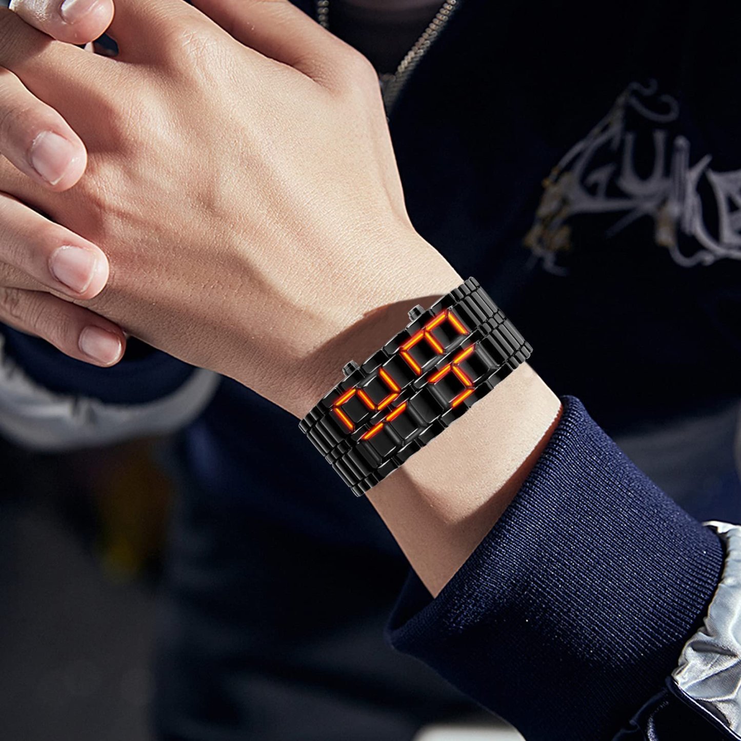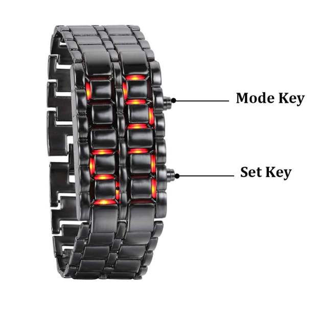 PRECISE: Electronic movement provides accurate and constant time keeping. LED digital time display. Clear and easy read. Top row LED lights for hour or month, and bottom for minute or day illuminating display.